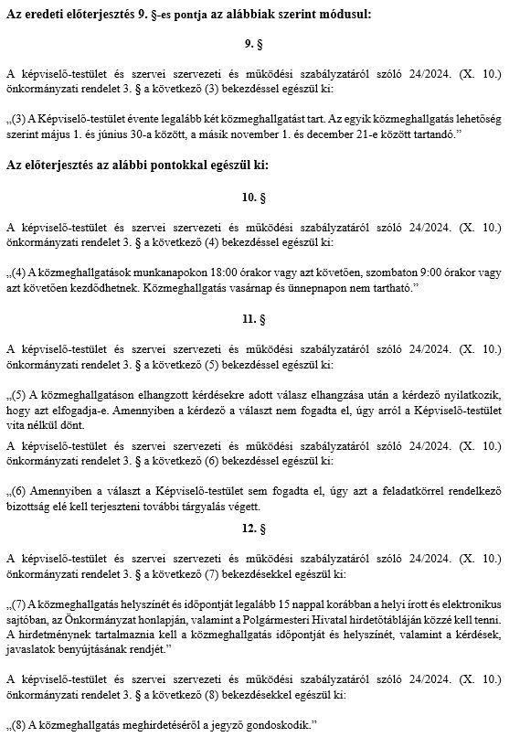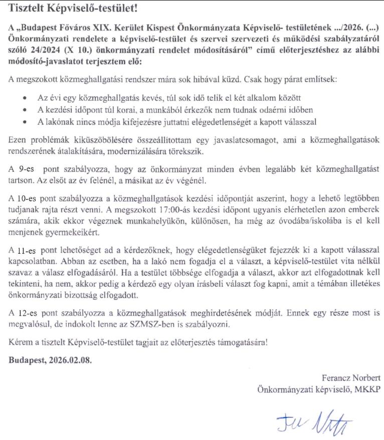 A Fővárosi Kormányhivatal küldött néhány javaslatot az SZMSZ-ünkhoz, hogy szerintük hol szorulna módosításra és kiegészítésre. Ezt a testület megszavazta, én viszont készítettem hozzá egy módosító-javaslatot is, a közmeghallgatási rendszer megreformálására, melynek részletei az alábbiakban olvashatóak: